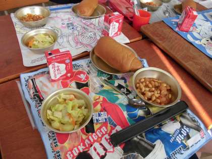 今日は大豆と鶏肉のトマト煮と野菜のソテー,チーズ,黒糖コッペパン,牛乳でした。野菜のソテーは,野菜がちゃんと蒸してあるのでとっても甘味がありおいしいのです。みなさん完食でした。