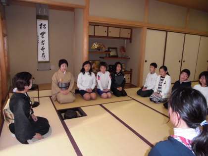 三回目の茶道教室です。畳のへりから16目を一生懸命に数えています。さぁ準備完了で,背筋をのばして,たがいに挨拶をしました。