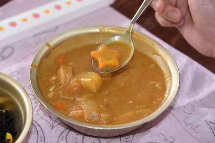 給食の「チキンカレー」の中に,幸せニンジンが入っていました。星形でした。今回は,1個だけ見つかりました。入っていた人は,とてもラッキーでした。
