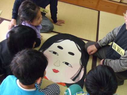 今日は,地域の方に昔の遊びをいろいろ教えていただきました。ふくわらい,けん玉,コマ,おはじき,百人一首などをしたり,紙飛行機やかぶとを新聞紙で折ったりしました。みんな楽しんでいました。