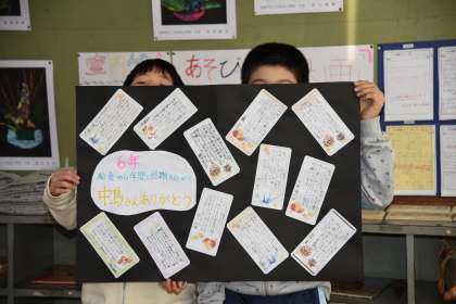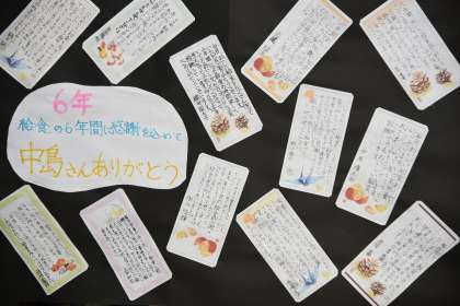 給食感謝週間のメッセージカードを書きました。みんなのを集めて台紙に貼りました。しばらくすると給食室に掲示される予定です。