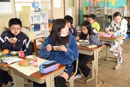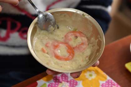 給食のシチューの中から幸せニンジンを発見!一人の食器の中から2つも入っていたので,大驚きです