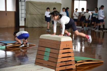 跳び箱を横向きに置いて,開脚跳びをしました。大きく足を開いて高く跳びました。