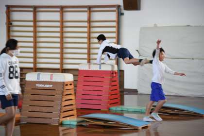 開脚跳びと台上前転をしました。台上前転も上手にできました。次回は,段を増やして挑戦します。