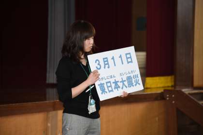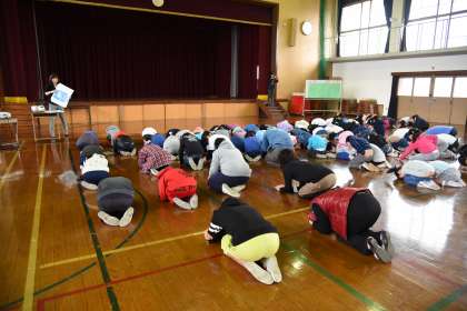 11日,金曜日は「東日本大震災」の日です。その日に行う,シェイクアウト訓練の意味を考えました。安全姿勢も練習しました。