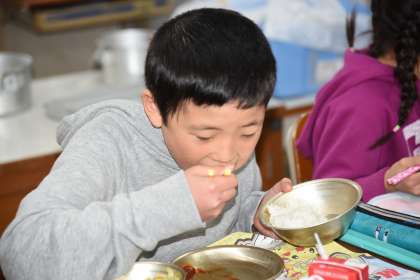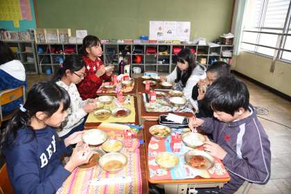 給食は,6年生の卒業をお祝いしてトンカツが出ました。6年生はこれまで,約1180回の給食を食べてきました。給食に感謝して,トンカツを食べました。