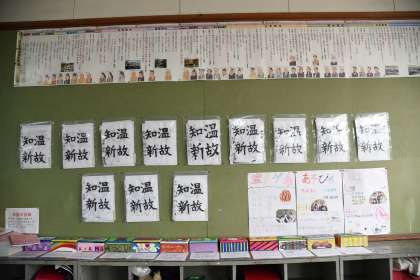 階段や廊下の掲示板は,卒業に向けた掲示に変わります。そのために,れまで階段の掲示板に貼っていた習字を教室に貼り替えました。