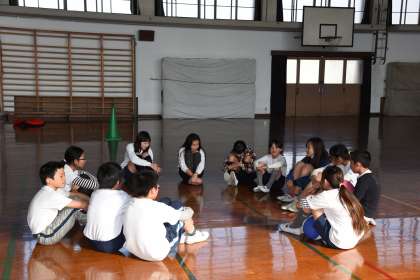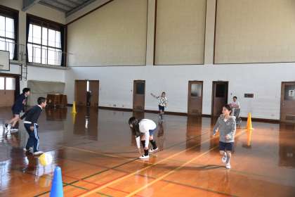 ボールを2個使ってドッジボールをしました。スリルがあって楽しみが広がりました。終わってからは,反省会をしました。