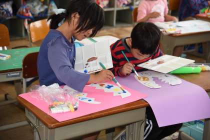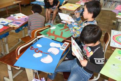 タマゴから素敵な物が生まれてきます。何が出てくるか豊かな発想で絵に描いています。完成するのが楽しみです。