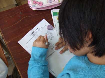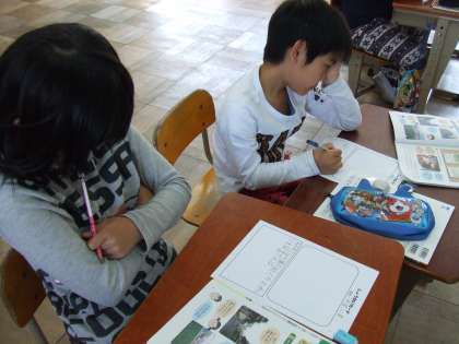 社会の「わたしたちのまち みんなのまち」で,自分たちのまちの紹介したい場所をカードに書いています。どこを紹介しようか,じっくり考えています。
