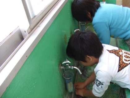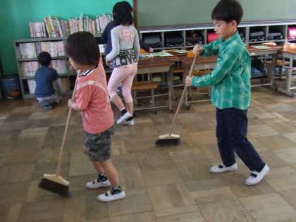 新しい掃除場所にも少しずつ慣れてきました。協力してごみをはいたり,手洗い場を一生懸命磨いたりして頑張っています。