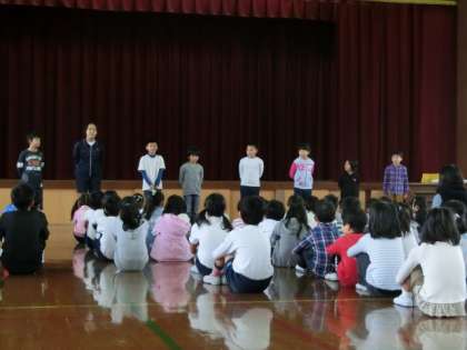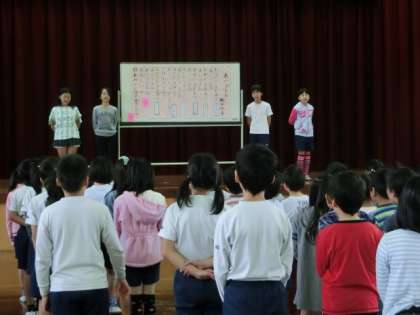 そのあと集会委員の「群読集会」では早速4年生の集会委員にも役割があり,全校の前に立って群読のお手本となりました。