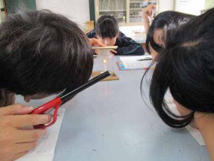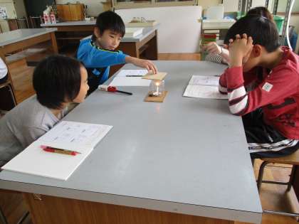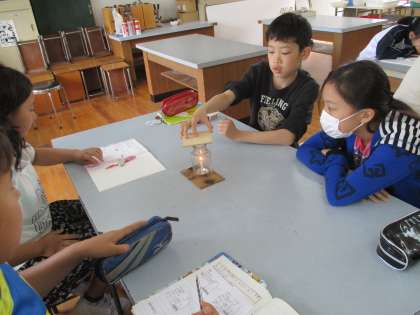 今日は,「びんの中で,ものが燃え続けるためには,どうすればよいのか」を実験しました。びんのふたをせまくしたり広くしたり,いろいろな場合を調べます。子どもたちは,前の実験の結果を生かした予想を立てていました。また,予想を立てるだけではなく,理由もしっかりと考えられていました。とても素晴らしいことです。また,火の様子をじっと観察し,結果もしっかりとノートに残すことができました。次は,友だちの良い意見も,自然とノートに残せるようになるといいなと思いました。