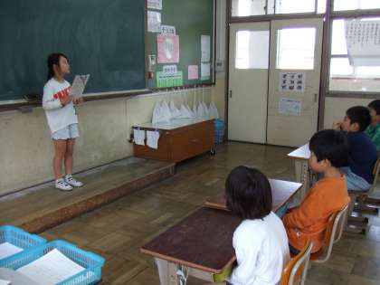 朝の会では,1分間スピーチをしています。日直の人がスピーチをするので,あらかじめ話すことを考えています。スピーチの後には聞いていた人に質問や感想を聞きます。少しずつ詳しく言えるように1年間続けていきます。