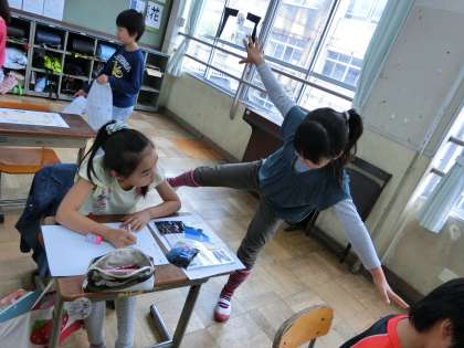 図画工作科「わすれられない あの時」では,心に残った出来事を,その時の気持ちが伝わるように絵に表わします。今日はイメージスケッチをして構成を考えました。友達同士でポーズを取り合い,スケッチする姿が見られました。