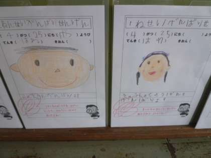 クラスの掲示では,自分の似顔絵とともにがんばり宣言を書いて掲示しています。