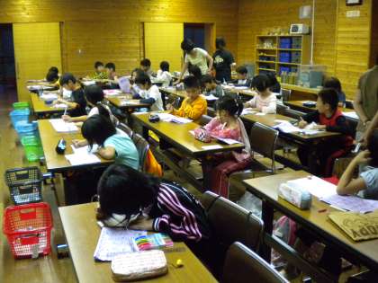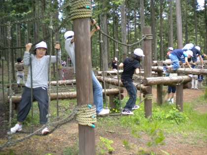 山の家の様子をお伝えします。上の写真は「京北森林公園」の全景です。昨日はここで午前中「マガジンラック」を作り,端材で遊ばせていただきました。お昼のお弁当はとてもおいしく,ボリュームもありました。午後はハイキングをし,山道を歩きましたので,子ども達は自然を肌に感じたようでした。ハイキングの後,少しだけアスレチックで遊びました。夜は毎日その日の「活動のまとめ」を行っています。その日のうちに心に残っていることを書きため,最終日に一人一人の新聞として仕上げます。