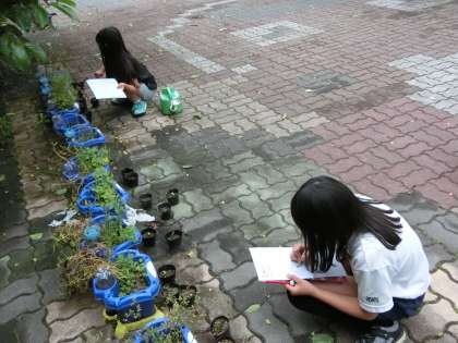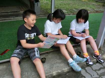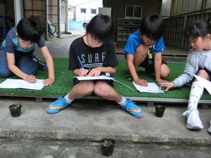 やっと芽が出たツルレイシを,理科の時間に観察しました。発芽した日の違いから,成長に差があるツルレイシを見て,「色がだんだん濃くなっている。」「巻きひげはどのくらいでできるのだろう。」など,気づいたことをカードに書きました。