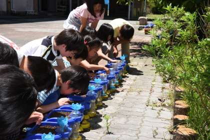 ミニトマトに水やり(2年生)