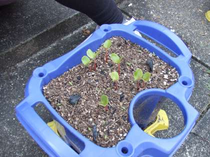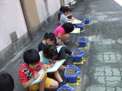 以前植えたホウセンカが芽を出したので,観察しました。葉や茎の色,形,手触りなどみんなで観察してカードに記録しました。