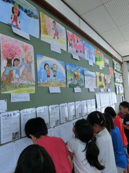 土曜参観の後の4時間目には,図工の絵の作品鑑賞をしました。「白や黄色を使って,光っている感じがよく出ている。」「明るい色で,楽しい気持ちが伝わってくる。」