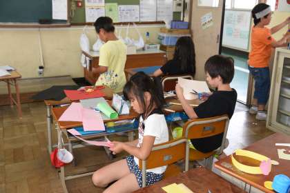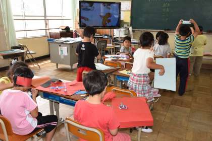 色画用紙を使って輪っかを作り,身につけます。たくさんきれいに飾りをつけて変身します。王冠や帽子などを作ったり,ベルトや腕輪を作ったりしました。