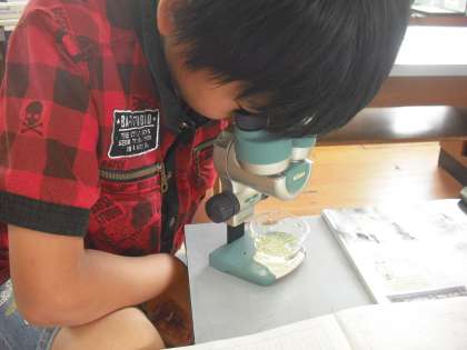 ファーブルを使って 一人ずつ メダカを観察しています。