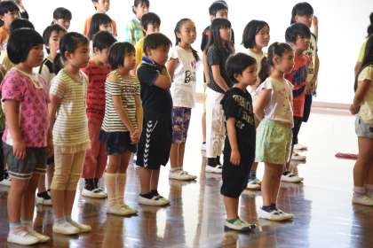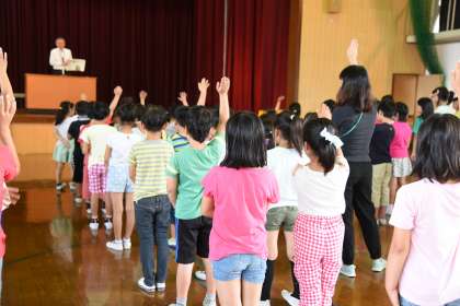 朝会で校長先生の話を聞きました。二の北10の約束とアメリカ大統領が広島を訪問した話を聞きました。