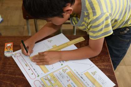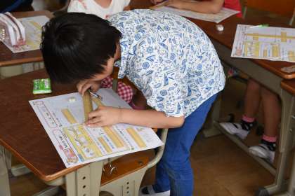 算数科で直線について学習しました。点と点を正確に結ぶ線を引くのは思ったよりも難しいようです。何度も練習しました。