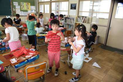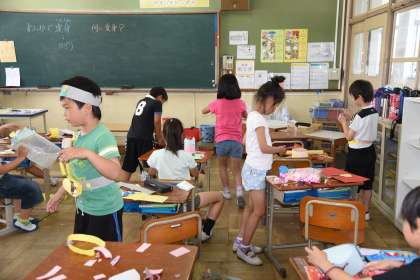 輪っかを作りそれに飾りを付けて変身します。仮面や帽子などを作って工夫していました。