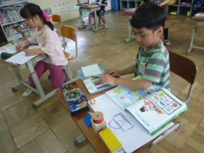 子どもたちは,教科書を参考にしながらいろんなえをかいていました。