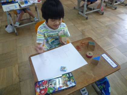 今日の算数の学習では,昨日学習した「はこのかたち」「つつのかたち」「ボールのかたち」をつかってかたちを写し取り, 絵をかきました。