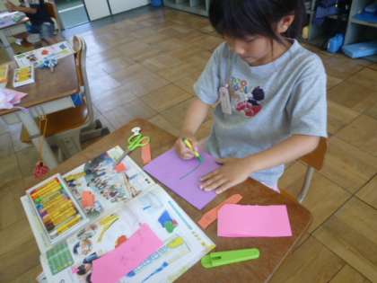 まずは,紙がどうしたら立つかをみんなで考え,色画用紙にたくさんの建物や動物を描きました。みんなが描いた作品を集めると,町になりました。友達とたくさんお話しながら町を組み立てる姿がとても素敵でした。