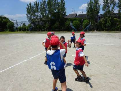体育では今エンドボールに取り組んでいます。得点につなげるにはどうすればよいかチームで話し合いながら進めています。