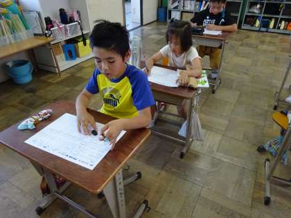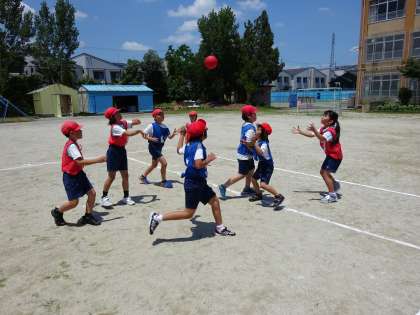 早くパスを回すにはどうすればよいか,空いているスペースを見つけてすばやく動いたり,声かけをしたりいろいろな工夫をみんなで見つけました。活動の後にはカードで振り返り,次時のめあてを考えています。