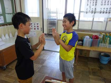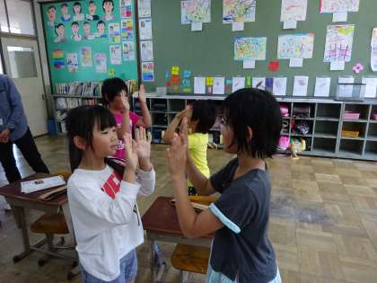 音楽の授業で,「茶つみ」を歌っています。手遊びも交えながら楽しんで歌っています。