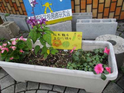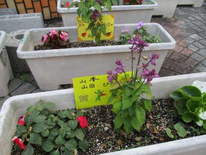 先日みんなで協力して植えた花が,すくすくと成長しています。毎日栽培委員さんが,水やりをしてくれています。また,休み時間などを使って,自分の植えた鉢に,水をやってみるといいですね。