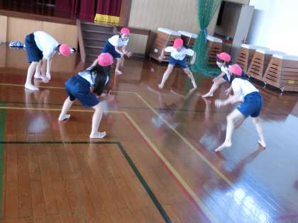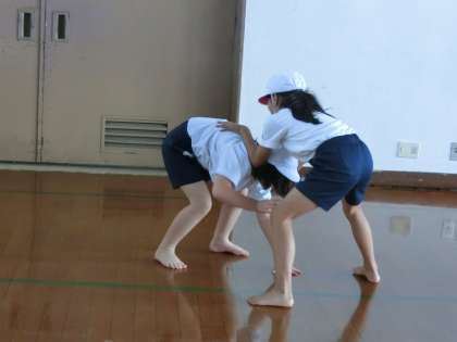 体育では相撲遊びに取り組んでいます。力を入れて押すための姿勢や,踏ん張るための工夫を考え,友達と勝負して楽しんでいます。