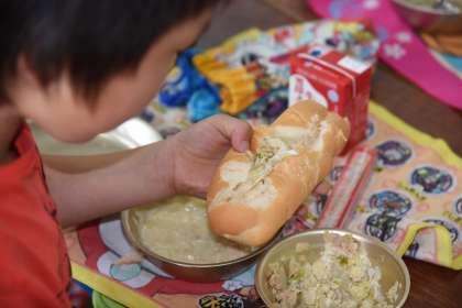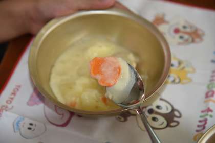 給食のシチューに「幸せニンジン」が入っていました。車の形でした。パンにツナサンドの具を挟んで,サンドイッチにして食べました。
