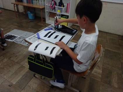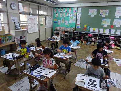 今日は2回目の書写でした。前回は学習の用意の仕方や使い方,筆のもち方など,学習の基本的なことを学びましたが,今日ははじめて文字に挑戦しました。今日の字は「一二」です。練習するにつれて力強い線が引けるようになりました。