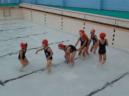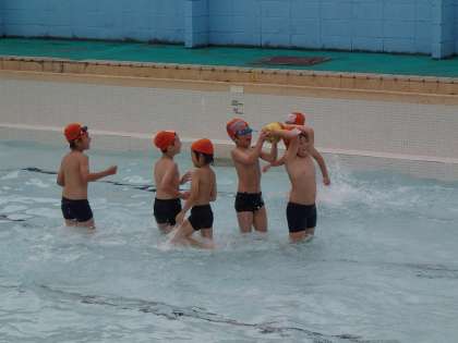 水慣れのための低水位でのプール学習をしました。ボールを運ぶ競争をしました。楽しく遊びながら水に慣れました。