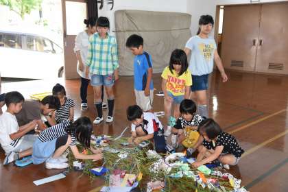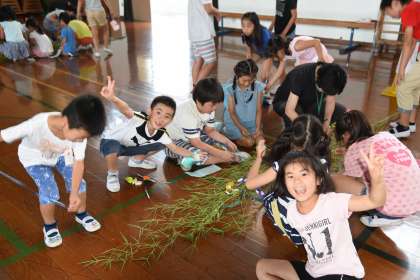 竹の笹に飾りを付けました。1本の竹に2つのなかよしグループで飾りを付けました。2年生の願い事も飾られています。明日の6月集会で発表します。見に来てください。