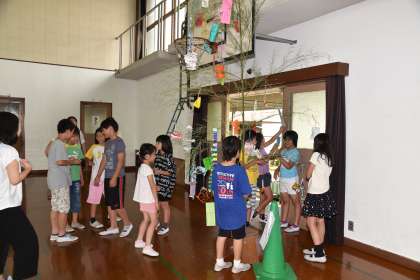 6月集会が終わって,体育館に飾られている笹飾りを見ました。一人一人の願い事がしっかり書けていました。2年生の願い事は,幸せに暮らすことや習い事がうまくなることが多くありました。