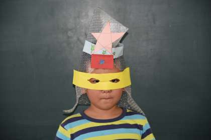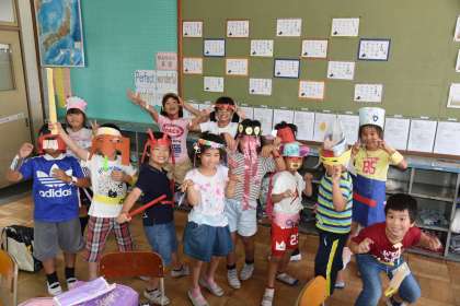 図工の時間に作った「輪っかで変身」の作品を身につけました。うまく変身できていました。誰だか分からないくらい見事な変身でした。