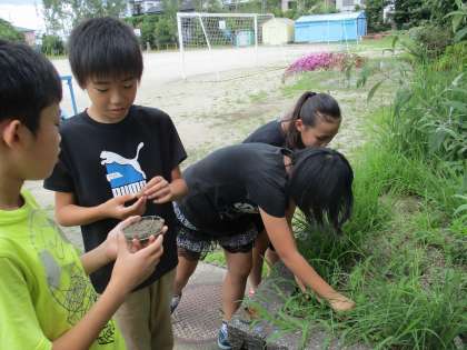 理科の「生物どうしの関わり」という単元で,「食べる・食べられる」関係について学習しました。そこで,ダンゴムシは何を食べるのかを予想して,ダンゴムシと食べ物を採取しに行きました。