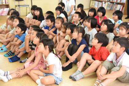 地域の方に絵本の読み聞かせをしていただきました。「オラウーちゃん」と「ユメリとおばけのなかまたち」の2冊の絵本を読んでもらいました。2年生も静かに聞き入っていました。