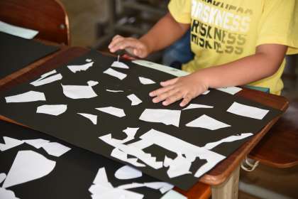 白い画用紙を適当にはさみで切って,黒い画用紙の上に並べました。想像力を発揮すると何かに見えてきます。不思議な作品ができてきました。