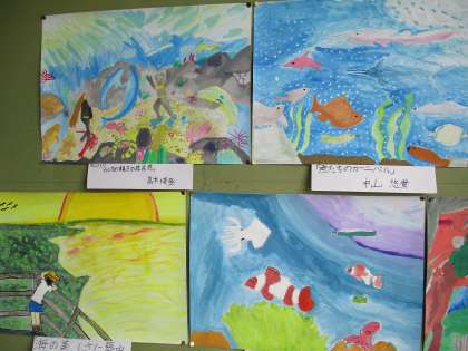 図工で描いていた「未来に残そう青い海」の絵画が完成しました。素晴らしい作品がたくさんできました。