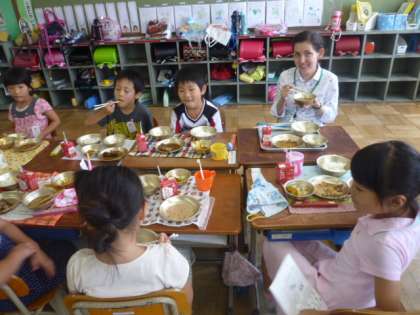 今日はキャンディス先生と一緒に給食を食べました。