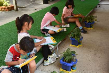 育てているミニトマトの花が咲き始めました。黄色い花がたくさん咲いたので,観察しました。